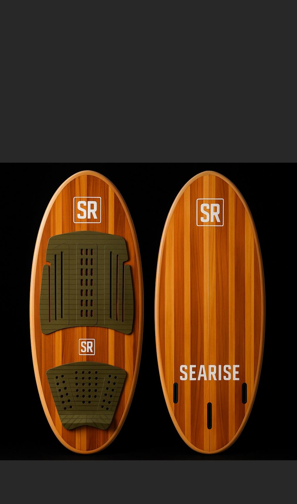 Our wakesurf boards offer a wide range of design options, from molding to epoxy resin molding, allowing for aesthetically pleasing designs. This particular board features a wood veneer that provides texture while maintaining a conventional structure, along with dark, perforated EVA, highlighting its unique character.